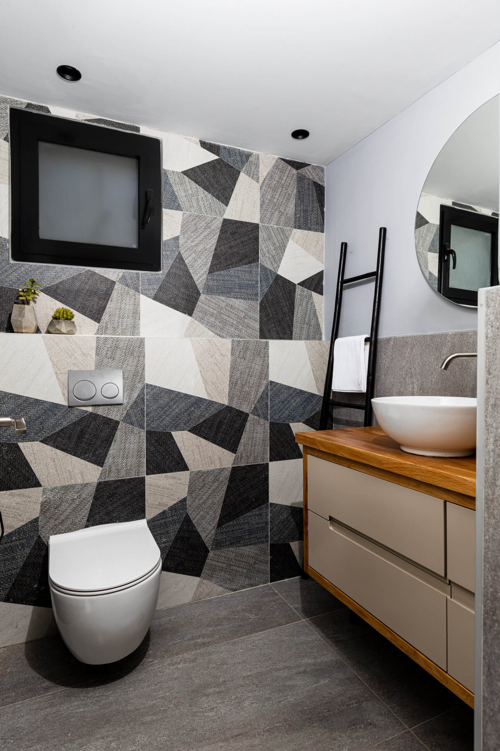 פתחנו את המטבח שתוכנן כיחידה אחת עם פינת האוכל, לתוך החלל הציבורי של הבית. לאיזורי העבודה בחרנו מישטח פורצלן יפיפה ולאי הגדול הוצמד שולחן אוכל ענק, שישמש גם ליום יום וגם לאירוח. בחדר הרחצה שינינו את המיקומים כדי ליצור מקלחת מרווחת וארון אמבט גדול, ושירותי האורחים שופצו מהיסוד וקיבלו חיפוי קיר בולט ושמח.