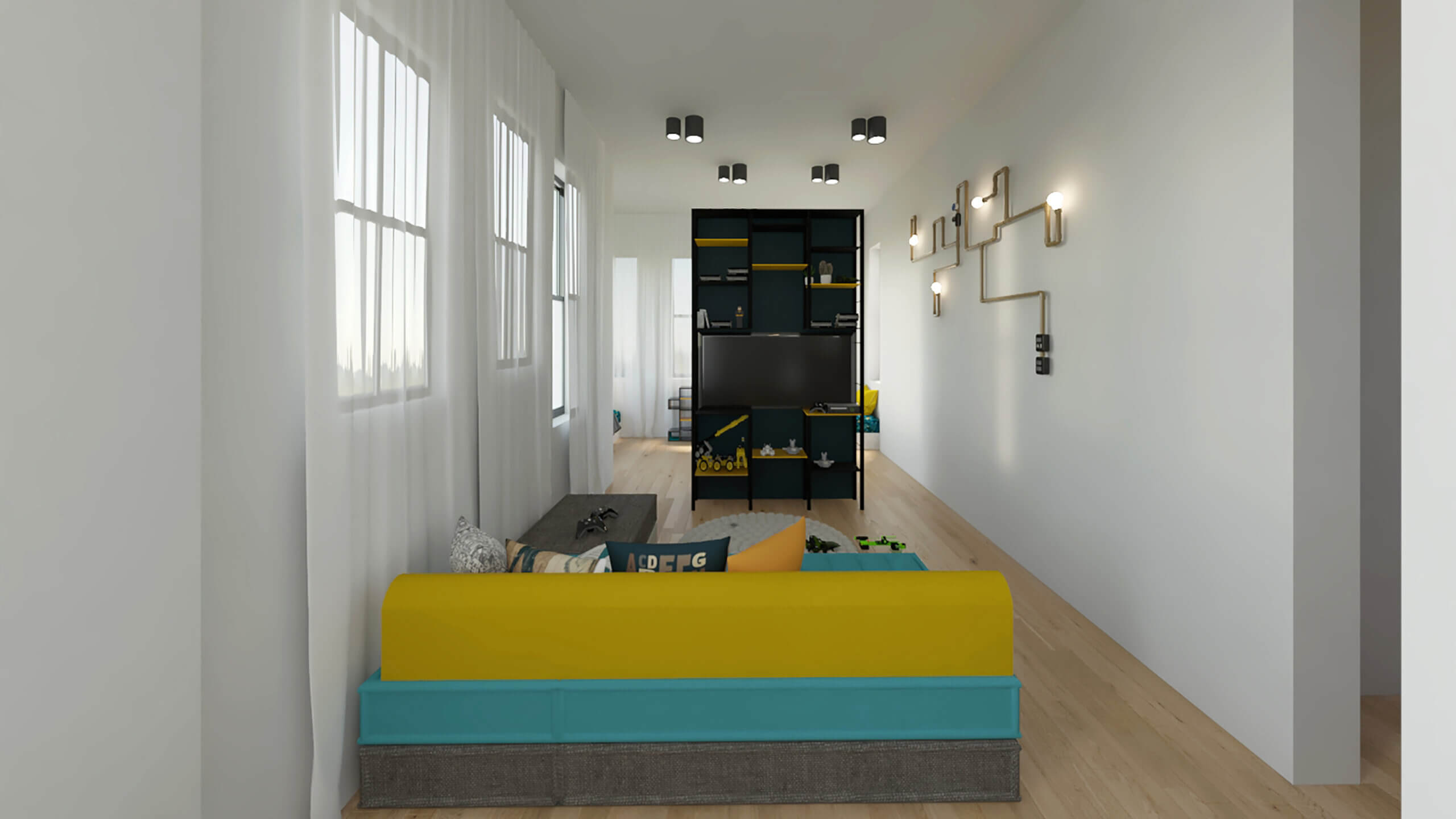 במקביל לגיבוש הקונספט העיצובי החלטנו שהקומה הראשונה, הגדולה יותר, תשמש את המשפחה למגורים. תכננתי הפרדה מקסימלית בין החללים השונים בקומה על ידי מחיצות שעומדות באופן עצמאי, ושימוש באלמנטים שחוזרים על עצמם בחללים השונים, בעיקר ספריות שונות, שמאפשרות למשפחה להכניס את הבלאגן לתבניות.