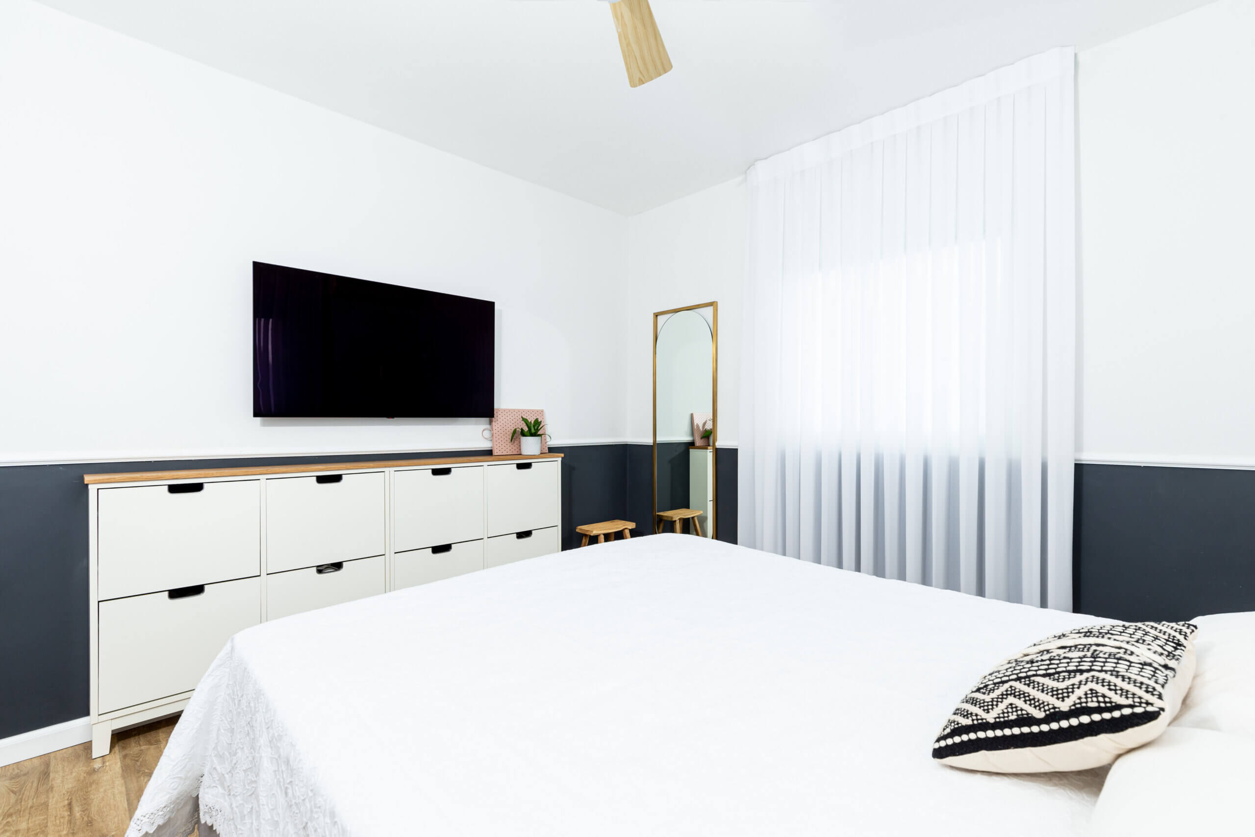 כיוון המיטה השתנה ונוצר מקום גם לארונות נעליים, נבחרה פלטת צבעים רגועה ונעימה ווילונות רכים ניתלו להשלמת האוירה.