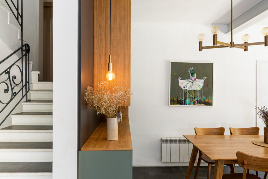 הוספנו ארון פינת אוכל מיוחד, חיפוי קיר עד גובה התקרה ויצירות אומנות מקוריות – והחלל הפך למתוחכם ומתאים לכולם.